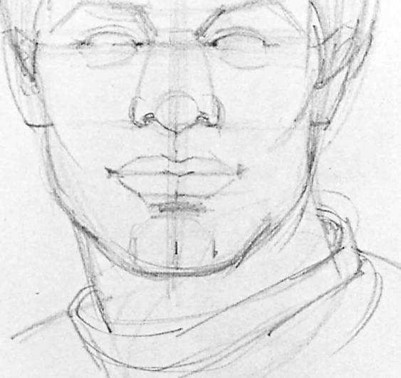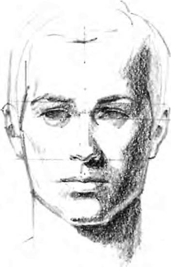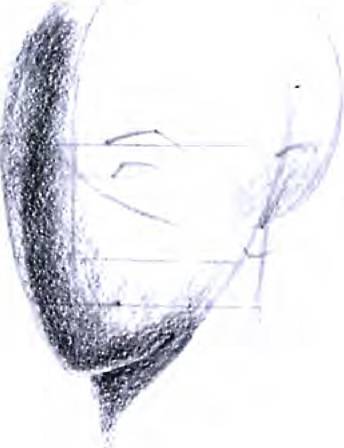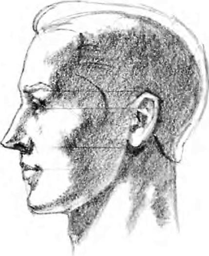 Step 2. The artist reshapes the contours of the head over the original guidelines, adding the angular details of the brow, cheek, chin, andjaw+ The features appear in their correct places on the horizontal guidelines. Although the head is turned to a three-quarter view, the ear still aligns roughly with the eyehrow and nose. Notice how the tip of