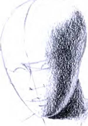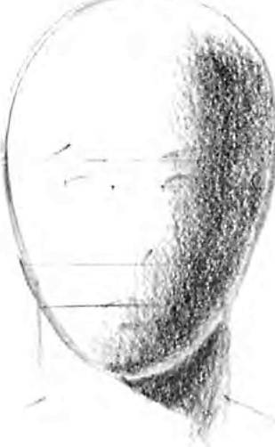Step 3* The artist blocks in the tones with rough strokes, First he places the biggest tonal shapes on the side of the brow, cheek, jaw, and chin. Then he moves to the features, adding tone to the eye sockets, eyelids, nose, and lips. The nose casts a slanted shadow downward toward the right. As usual, the upper lip is in shadow, the lower Mp catches the light, and there's a deep shadow beneath the lower lip.