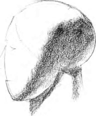 Egg Shapes* When you draw a side view, visualize the head as two overlapping eggs; one vertical and one horizontal, with both tilting a bit. Once again, looking from left to right, you can see the tonal gradations of light, halftone {or middletone), shadow, and reflected light. There's a similar gradation on the right side of the cylindrical neck.