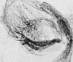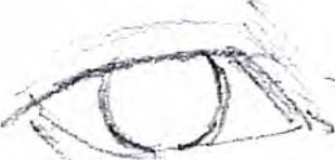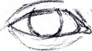 Step 2- The artist draws the contours of the eye and the eyelids carefully over the sketchy guidelines of Step I. Because we Ye looking down at the eye from above, we see a lot of the upper lid, and the shape of the eye itself seems more slender than it looks in a front view. The artist sharpens the lines of the iris and draws the pupil. He draws the tear duct more precisely. Then he begins to suggest the inner contours of the eye socket with groups of curving lines that follow the rounded shape of the socket. Note how the upper lid overlaps the lower lid at the outer comer.