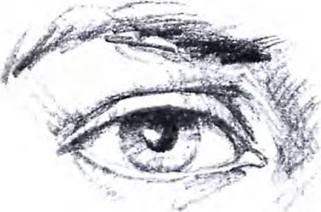 Step 3. Moving the side of the pencil lightly over the paper with parallel strokes, the artist begins to block in the tones. He darkens the eyebrow and indicates the shadow beneath the brow, just above the bridge of the nose. He adds shadows to the edges of the curving eyelids and places a deep shadow in the eye socket, just above the upper lid* The upper lid casts a distinct strip of shadow over the iris and the white of the eye. The artist darkens the iris and the pupil.