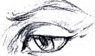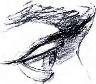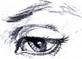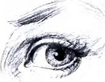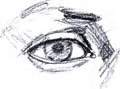 Step 3. To block in the tones, the artist moves the side of the pencil lightly across the paper. Clusters of curving, parallel strokes suggest the roundness of the eye socket, above the eye and in the corner adjacent to the nose. The shadows on the lids are also executed with curving strokes. The iris is darkened with parallel strokes, and the artist presses harder on the pencil to darken the pupiL Horizontal strokes suggest the shadow cast by the upper lid across the iris and the white of the eye. A deep shadow is placed in the inner corner of the eye< Long, curving, rhythmic strokes suggest the eyebrow,
