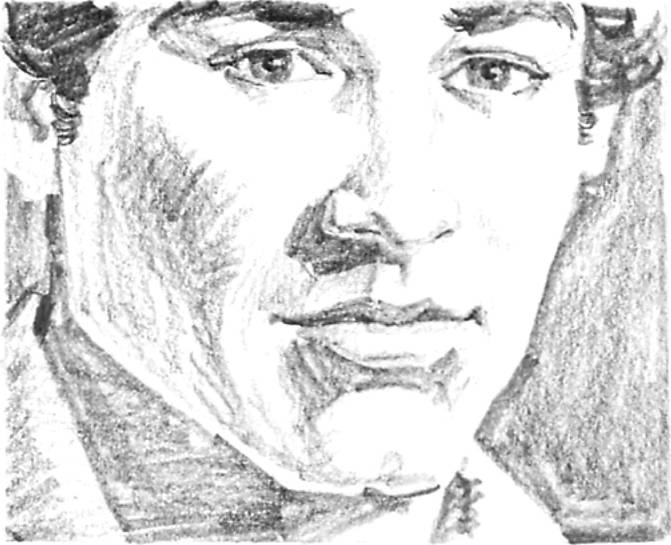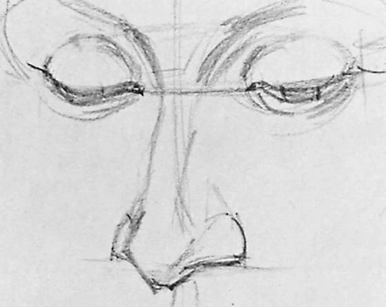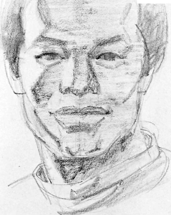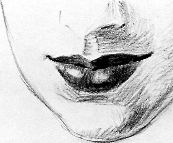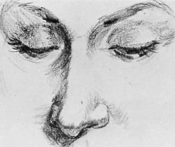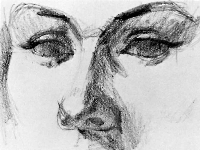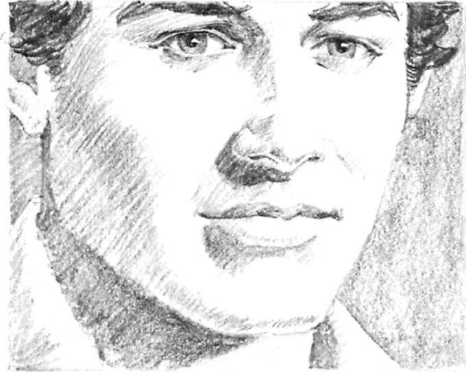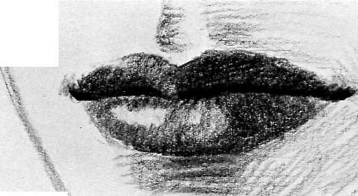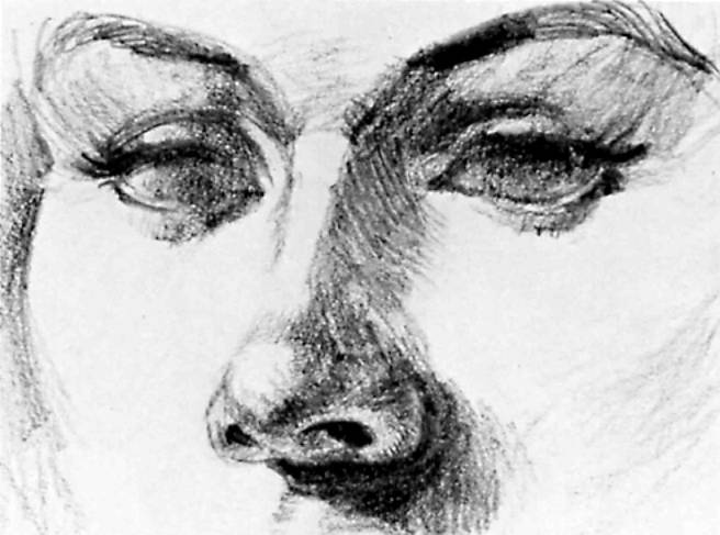 strengthens the darks of the eye sockets and lids, the lips, the undersides of the checks, and the sides of the jaws. The tip of the pencil accentuates the contours of the eyelids, irises, and pupils; the nostrils: and the dark dividing line between the lips.