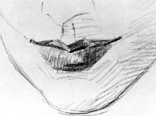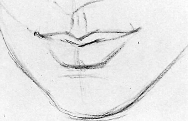 Step 1- The artist begins to draw the mouth with straight, simple construction lines. Down the center of the drawing, you can see the vertical center line that helps him construct a symmetrical mouth and chin. The dividing line between the lips is one of the horizontal guidelines that the artist draws across the egg-shaped head. Above this horizontal line, the artist draws four basic lines for the upper lip and three lines for the lower lip, plus a scribble to suggest a shadow beneath the lower lip. Note that he also indicates the groove that travels from the upper lip to the base of the nose.