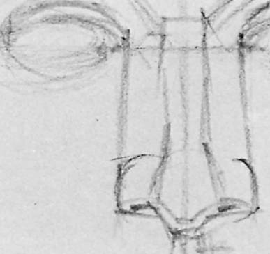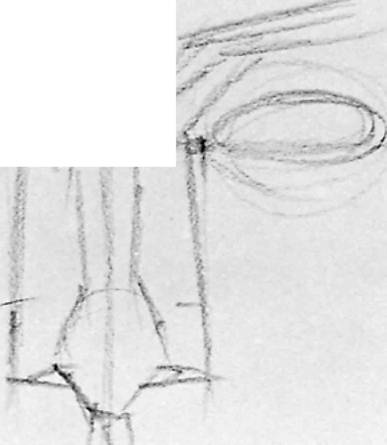 locates the eyes with tiny touches of the pencil point. Moving down to the line at the base of the nose, he locates the outer edges of the nostrils in the same way. The neck is a slightly slanted cylinder once again. Notice that the back of the head protrudes well beyond the line of the neck.