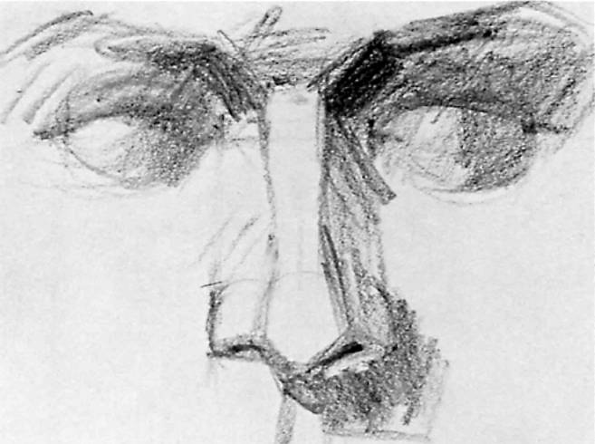 Step 4. Now the artist turns the thick lead on its side and moves it swiftly back and forth over the rough surface of the paper to indicate the big tonal areas. The paper is so rough that you can hardly see the individual strokes-the texture of the paper dominates the tones. The lines of Steps 1, 2, and 3 rapidly disappear under the ragged masses of tone. For the paler tones, the artist moves the drawing tool lightly over the paper, pressing harder and piling up additional strokes for the darker areas-such as the eye sockets, the cheeks, the shadow cast by the nose, and the hair, Most of the original lines have disappeared under the tones, The artist erases the others. The main purpose of Step 4 is to establish a clear distinction between the lights (which are just bare paper), the darks, and the middletones (or halftones).
