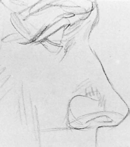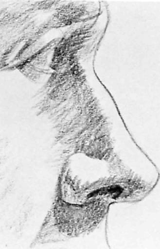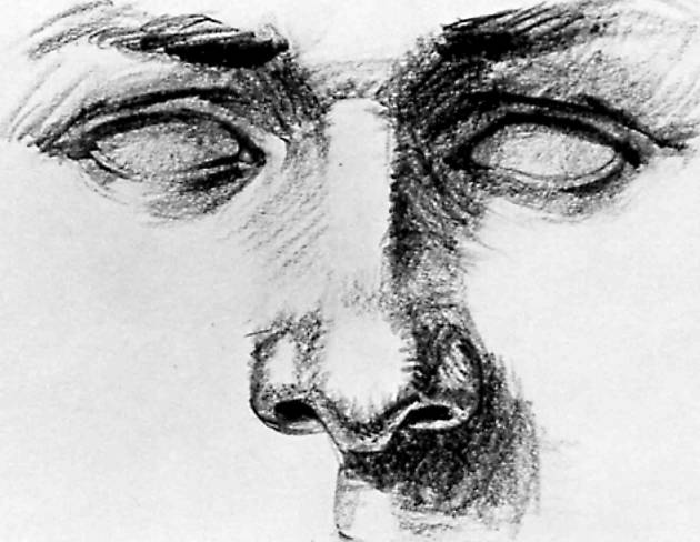eye sockets, the underside of the nose and nostrils, the lips, the tones within the ears, and the shadow beneath the chin. With the point of the pencil, he sharpens the contours of the ears, emphasizes the detail of the eyes and eyebrows, draws the nostrils more precisely, and suggests the detail of the collar. He completes the hair with broad strokes made with the side of the lead.