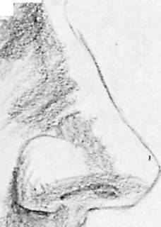 Step 3. The artist completes his preliminary line drawing of the outer contours of the head and the .shapes of the features. He strengthens the lines of the jaw and the chin. He draws the ear more precisely and adds the inner contours of the eyes, with a hint of darkness on the irises. He traces the bridge of the nose and constructs the tip of the nose and the nostril wings. He indicates the groove from the base of the nose to the upper lip. As he defines the lips, he darkens the corners of the mouth and indicates the concavity beneath the lower lip with a dark scribble. The outline of the hair is strengthened with quick, casual lines.