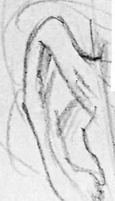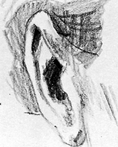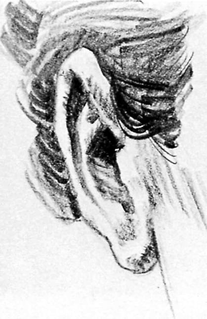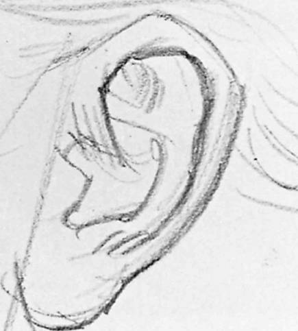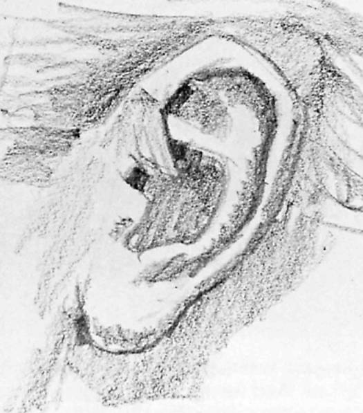 Step 3. The artist adds the pools of shadow within the car, which is darkest just inside the rim. He moves around the outer edge of the ear and around the lobe, adding touches of shadow that make the shape look three-dimensional. He suggests the hair surrounding the ear and begins to model the cheek and jaw. Notice the tiny pool of shadow where the lobe attaches to the jaw.