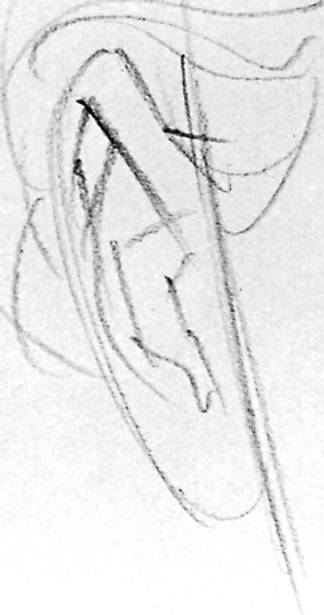 Step 2. Over the sketchy lines of Step 1, the artist draws the contours of the ear with darker, more precise lines. A dark inner line defines the sinuous shape of the rim, which winds around to the deep "bowl" at the center of the car. The artist draws the inner shape more exactly,