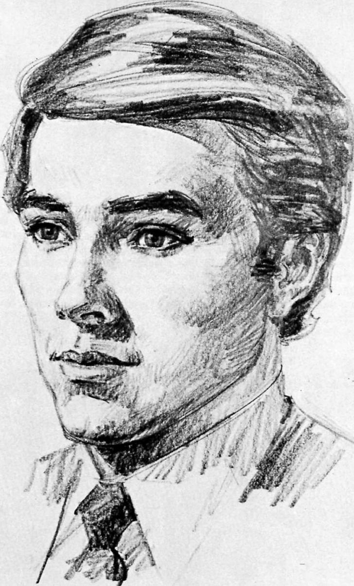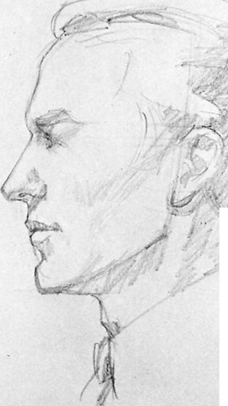 Step 4. The artist completes the drawing by darkening the tones with the side of the pencil and sharpening contours and details with the tips. He builds up the modeling on the shadow side of the face* where you can now see a distinct gradation of light, halftone, shadow, and reflected light. On the lighted side of the face, he adds touches of tone where the cheek and jaw turn away from the light. He darkens the