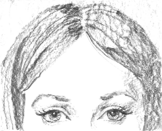 Step 7. The side of the 2B pencil deepens the tones with braid, bold strokes. Clusters of broad strokes move down over the hair to darken the shadow; the strokes are distinct enough to suggest the texture of the hair. The pencil point darkens the contours of the eyes, the tones on the side of the nose, and the tones of the lips; then it picks out more hairs within the eyebrows and more eyelashes. The pupils grow darker, as do the shadows beneath the upper lids. Finally, a kneaded rubber eraser cleans the lighted areas,