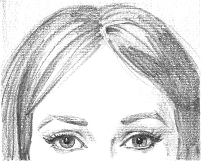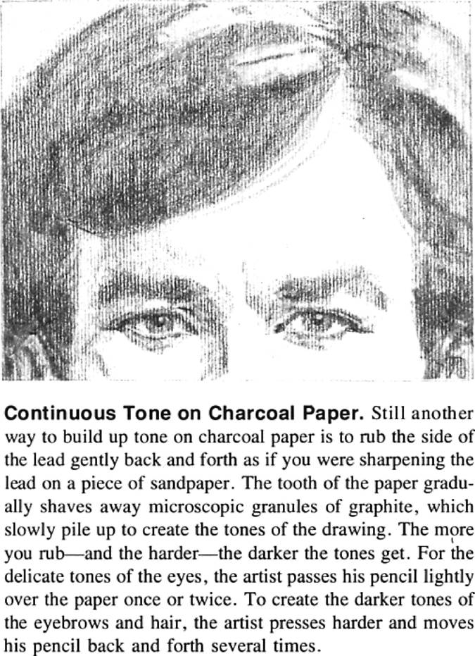 Strokes on Charcoal Paper. Charcoal paper isn't just for charcoal drawing, Its subtle, ribbed surface is equally good for pencil drawing, The delicate tooth (as it's called) of the sheet combines with the pencil strokes to produce a lively texture, In this close-up of a woman's portrait, the thick-and-thin pencil strokes in the hair are softened by the textured surface of the paper: tiny flecks of bare paper pop through even the darkest tones, making the strokes vibrate with a kind of inner light. These tiny flecks of bare paper lend softness and transparency to the tones around the eyes.