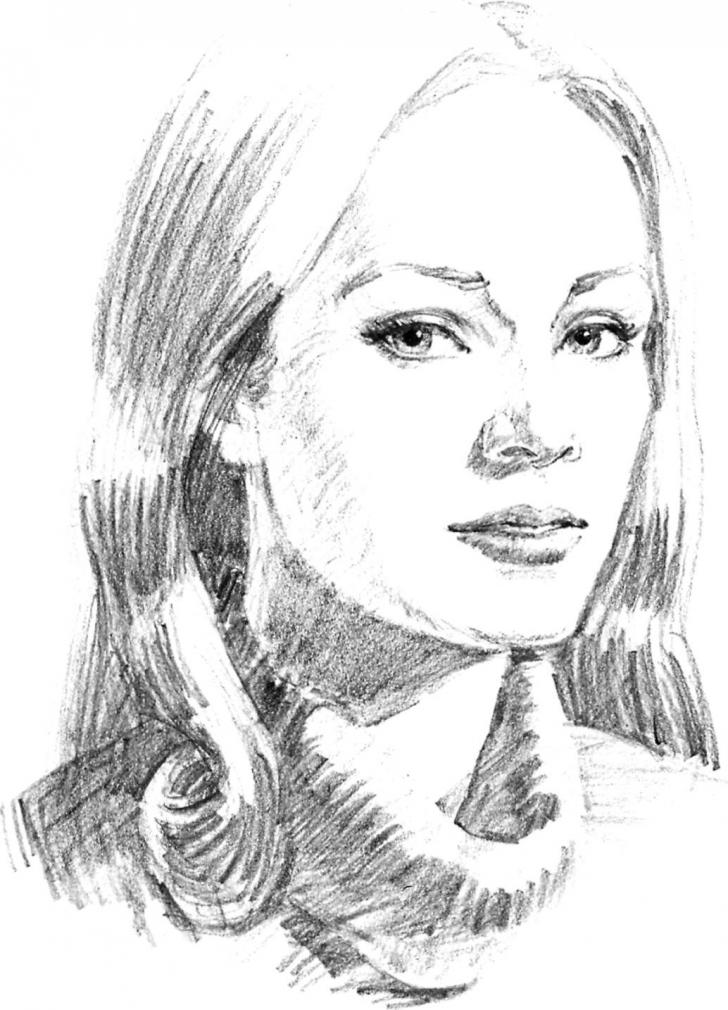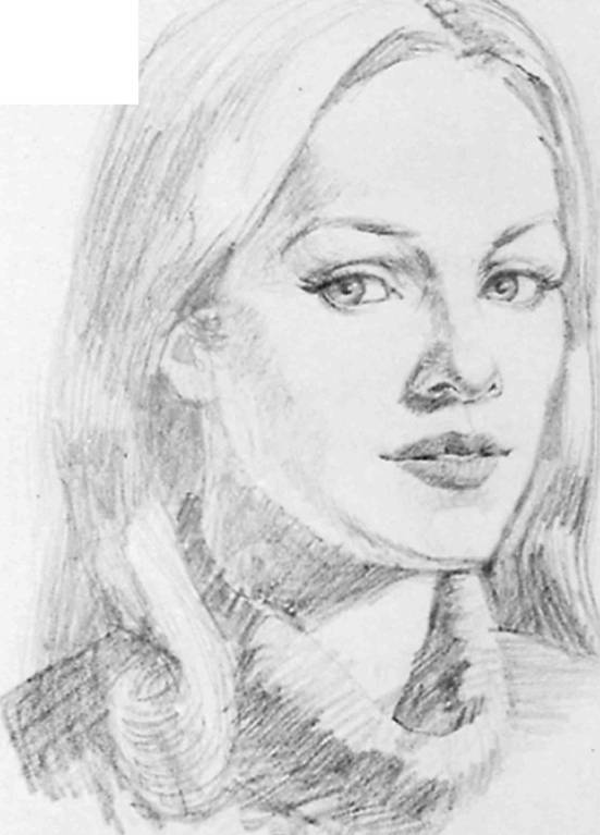 Modeling with Strokes, This woman's face is modeled with delicate strokes that travel carefully over the forms. For example, there are two patches of tone above the right eye socket; each consists of slanted strokes that are carefully angled to express the roundness of the form. Now folJow the route of the strokes that model the cheek on the shadow side of the face. In the pale halftone area under the eye, the lines are delicate diagonals. As the cheek turns away from the light, the strokes curve and darken. The entire face is rendered with carefully planned groups of strokes.