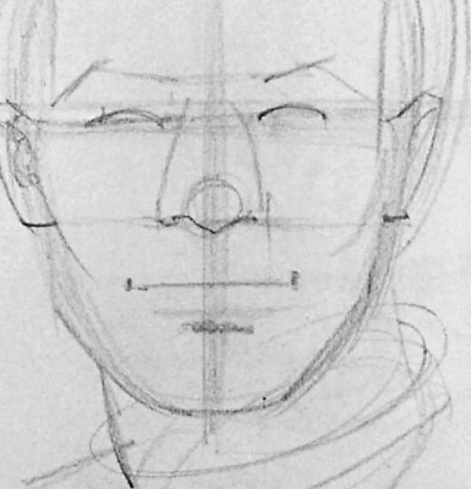 the nose and the nostrils are visualized as distinct forms. The eyelids are clearly drawn, as are the dark patches within the eyes. The upper lip has the distinctive wing shape, while the lower lip looks blocky and masculine. The hair starts just below the crown and extends beyond the guidelines of the upper egg shapes.