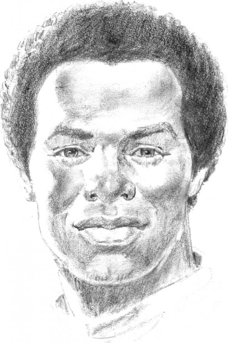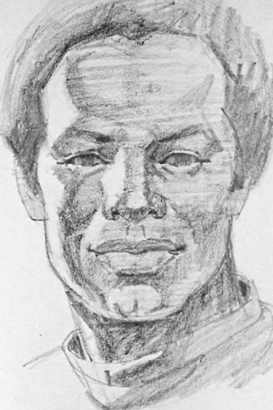 Step 6* Gradually, the strokes of the side of the thick pencil become more distinct as the artist continues to build up the tones. Observe the short, decisive strokes that mode) the eye sockets, the side of the nose, the comer of the mouth, and the tone that travels downward from the cheek to the jaw. The artist darkens the underside of the jaw with broad, distinct strokes that accentuate the squarish, bony shape. The hair is darkened with thick strokes that suggest texture and detail. With the sharp tip of the pencil, the artist begins to emphasize the features. He darkens the eyebrow and sharpens the lines of the eyelids. He adds crisp touches to define the contours of the nostril, lips, and car more precisely. Notice the tiny accents of darkness within the nostril, at the corner of the mouth, between the lips, and within the rim of the car.