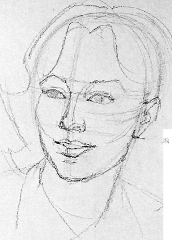 suggestion of tone to each eye socket, iris, and pupil, and then moves downward to add broad, simple tones to the nose and lips. As usual, the upper lip is darker than the lower, and there's a shadow beneath the lower lip- Touches of tone appear on the ears. The hair is visualized as a big, simple mass, lighter on one side than on the other.
