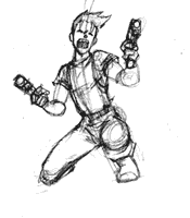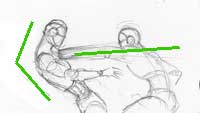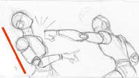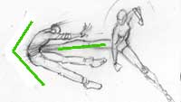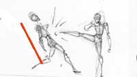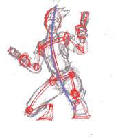 Action: ok, so you've mastered the typical standing figure and now you want them to actualy fight and move. The key here is the stick figure and the line of motion. Lot's of artist (myself included once) got all caught up in the clothes and muscles and details waaaaay to early in the drawing. The key to a good action pose is a strong foundation and the stick figure will help us with that. |