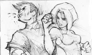 When you get to the stage of cleaning up your work and adding in details be sure and incorporate lines that translate the action taking place. The edges of her fist and arms are quick strokes following the direction her arm is travelling. his head is knocked back from the point of impact. His hair and spit show the continuance of the force of the punch. I put curved lines on his check to show an indentation where her fist connected |