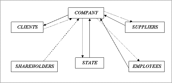 Companies are functioning into an economic environment. There are multiple links between companies and suppliers, clients, employees, state and shareholders due to the exchange of goods and services, on one hand and money, on the other hand. The following diagram reveals the real flow (exchange of goods and services), the financial flow (payments and receipts in cash) and the capital flow (shareholders' contribution to the business capital).
