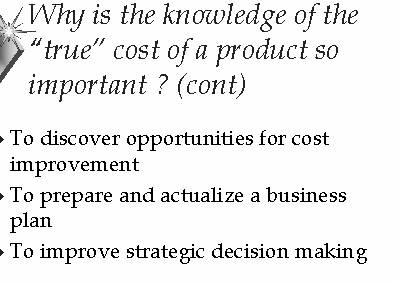 From an implementation point of view, the advantage of cost decomposition is that improvements in product cost, sometimes dramatic, can be made relatively quickly and with little analysis. Also, the data required to run the model is typically already available and being collected somewhere in the organization. The ABC model can often be built using the existing General Ledger package or spreadsheet software. Because of these factors, it is a relatively low cost, low risk strategy. This can be valuable in an environment where the value of ABC must be "proven" or in a pilot project where few resources are allocated or available to the project.