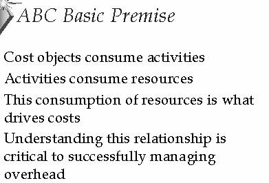 With ABC, all costs reside in resources, which are such things as material, labor, space, equipment and services. Resources are consumed by activities which have no inherent cost. The cost associated with activities represents the amount of resource they consume per unit of activity. Resources and activities are then applied to cost objects, that is, the purpose for which the resource is consumed and the activity is performed.