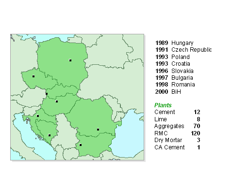 At present, Heidelberger Zement operates in Central Europe East 12 cement plants, 8 lime plants, more than 100 ready-mixed plants, 2 concrete products plants, 70 aggregates plants, 3 dry mortar plants and employs in this region about 12 000 employees.