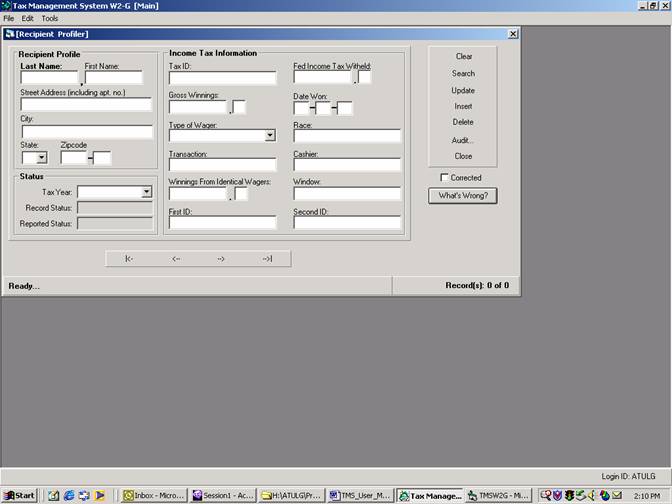 TMS is a management application for W2G Tax forms. It tracks recipient information winning wagers such as Bingo, Slots etc and creates a W2G Tax form for the recipient. At the end of the year the system creates a electronic file for the IRS for tax reporting purposes.