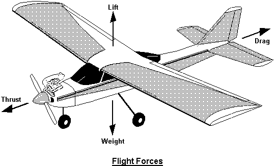 There are four (4) primary forces that act on an aircraft in flight; thrust, lift, drag, and weight. Thrust is the force applied by the combination of engine and propeller acting to pull the aircraft forward. Drag is the resistance against the aircraft by the force of the air against the forward facing surfaces. Weight is caused by gravity. In order for a constant speed to be maintained, thrust and drag must be equal. In order for a constant altitude to be maintained, lift and weight must be equal.