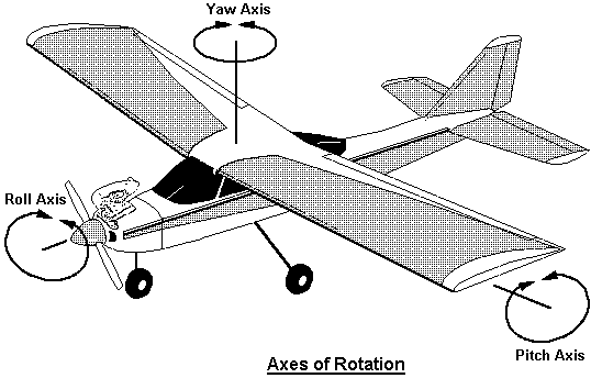 An aircraft pivots about three (3) axes; the yaw or vertical axis controlled by the rudder, the pitch or lateral axis controlled by the elevator, and the roll or longitudinal axis controlled by the ailerons. It can pivot about any one of these individually or in combination based on the control surfaces that are moved and the direction of the movement.