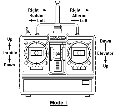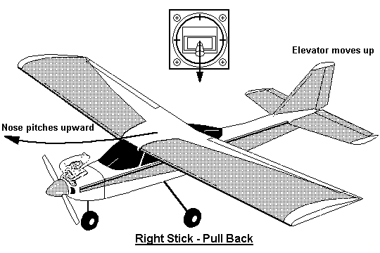 The new radio systems are proportional control meaning that the control surfaces move in proportion to the amount of movement of the stick. If the stick is moved half of its total travel in one direction, the corresponding control surface will move half of its total travel in the corresponding direction. A beginner must first know the effect that a stick movement has on the model. During normal flight, the throttle is set so that a constant speed is maintained. This means that thrust is equal to drag and lift is equal to weight. From this stable condition, the effects that the stick movements have on the trainer are described.
