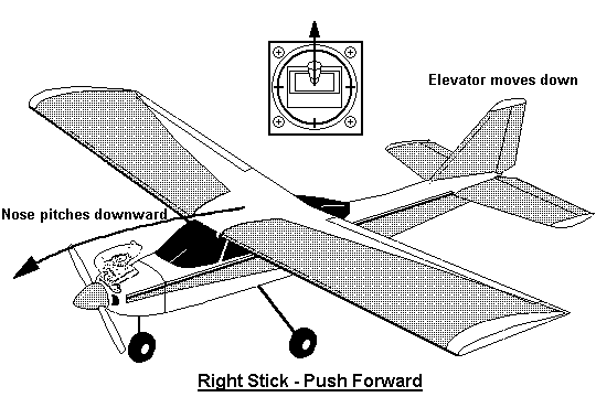 When the right stick is pushed forward, the elevator moves down. This causes the nose to pitch downward reducing the angle of attack of the wing and reducing drag. As the airplane descends its speed increases until drag and thrust are again in balance.