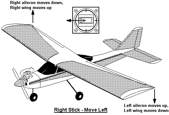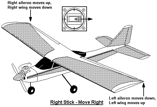 When the right stick is moved right, the left aileron moves down and the right aileron moves up. This causes the airplane to roll to the right meaning that the left wing moves up and the right wing moves down. It will continue to roll as long as the stick is held in the same position. When the roll takes place, lift is no longer oriented vertically so the effective lift decreases. As the angle of the roll increases, effective lift continues to decrease and the airplane will begin to drop.