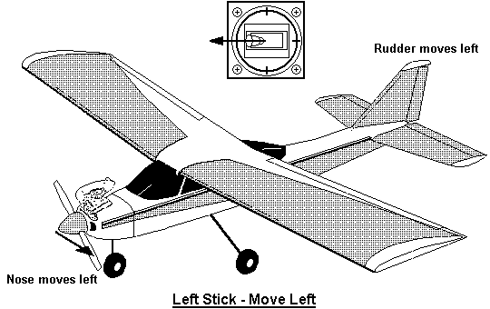 When the left stick is moved left, the rudder moves to the left. This causes the airplane to swing or yaw to the left. This causes the right wing to move slightly faster through the air causing an increase in lift. The combination of the yaw and the lift increase on the right wing results in a gentle turn to the left as long as the stick is held in position.