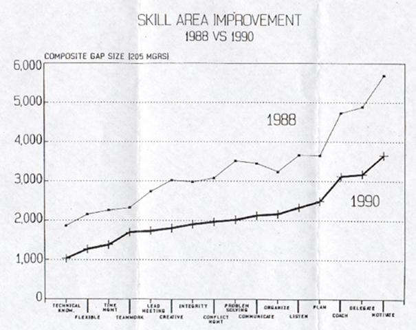 The Leadership Assessment Survey data collected in late 1988 was compared to the same data collected in 1990 with respect to "improvements" achieved by managers participation. Improvements were measured through reduction in the "gap size" in each of the sixteen skills areas under evaluation. "Gap size" is defined as the difference between what managers are doing and what others want the manager to do.