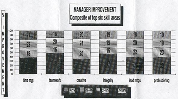As an example: Seventy-five percent of the 205 managers experienced an improvement or reduction in their gap size form 1988 to 1990 in the Time Management Skill area. Of this 75% of managers, 21% experienced an improvement anywhere from 0 to 25% in reducing their gap size. Twenty-three percent experienced an improvement anywhere from 26% to 50% in reducing their gap size. Eighteen percent experienced an improvement anywhere from 51% to 75% in reducing their gap size. Thirty-eight percent experienced an improvement anywhere from 76% to 100% in reducing their gap size.
