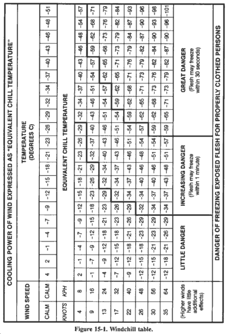 Windchill increases the hazards in cold regions. Windchill is the effect of moving air on exposed flesh. For instance, with a 27.8-kph (15-knot) wind and a temperature of -10 degrees C, the equivalent windchill temperature is -23 degrees C. Figure 15-1 gives the windchill factors for various temperatures and wind speeds.