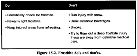 A loss of feeling in your hands and feet is a sign of frostbite. If you have lost feeling for only a short time, the frostbite is probably light. Otherwise, assume the frostbite is deep. To rewarm a light frostbite, use your hands or mittens to warm your face and ears. Place your hands under your armpits. Place your feet next to your buddy's stomach. A deep frostbite injury, if thawed and refrozen, will cause more damage than a nonmedically trained person can handle. Figure 15-2 lists some do's and don'ts regarding frostbite.