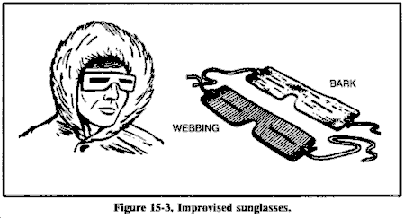 You can prevent snow blindness by wearing sunglasses. If you don't have sunglasses, improvise. Cut slits in a piece of cardboard, thin wood, tree bark, or other available material (Figure 15-3). Putting soot under your eyes will help reduce shine and glare.