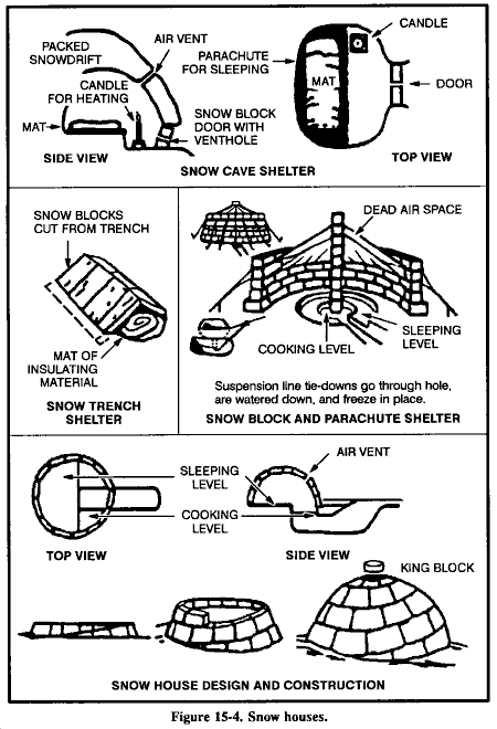 In certain areas, the natives frequently use this type of shelter (Figure 15-4) as hunting and fishing shelters. They are efficient shelters but require some practice to make them properly. Also, you must be in an area that is suitable for cutting snow blocks and have the equipment to cut them (snow saw or knife).