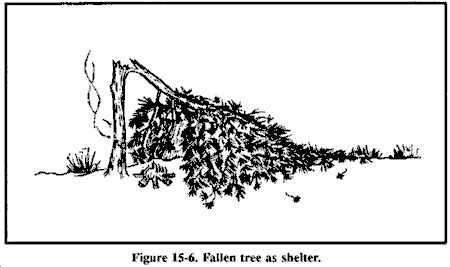 To build this shelter, find a fallen tree and dig out the snow underneath it (Figure 15-6). The snow will not be deep under the tree. If you must remove branches from the inside, use them to line the floor.