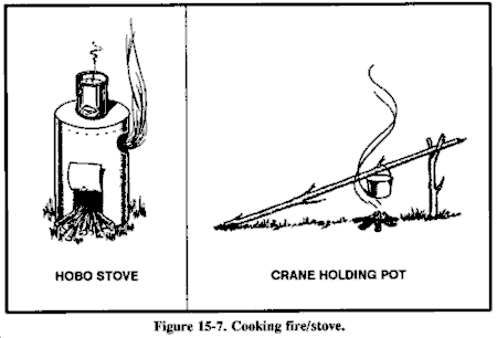 In general, a small fire and some type of stove is the best combination for cooking purposes. A hobo stove (Figure 15-7) is particularly suitable to the arctic. It is easy to make out of a tin can, and it conserves fuel. A bed of hot coals provides the best cooking heat. Coals from a crisscross fire will settle uniformly. Make this type of fire by crisscrossing the firewood. A simple crane propped on a forked stick will hold a cooking container over a fire.