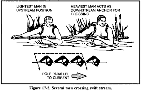 Using this method, you can safely cross currents usually too strong for one person to stand against. Do not concern yourself about your pack's weight, as the weight will help rather than hinder you in fording the stream. If there are other people with you, cross the stream together. Ensure that everyone has prepared their pack and clothing as outlined above. Position the heaviest person on the downstream end of the pole and the lightest on the upstream end. In using this method, the upstream person breaks the current, and those below can move with relative ease in the eddy formed by the upstream person. If the upstream person gets temporarily swept off his feet, the others can hold steady while he regains his footing (Figure 17-2).