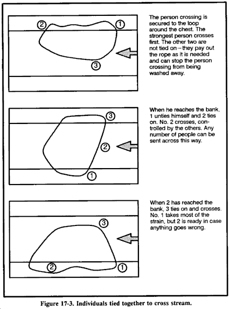 If you have three or more people and a rope available, you can use the technique shown in Figure 17-3 to cross the stream. The length of the rope must be three times the width of the stream.