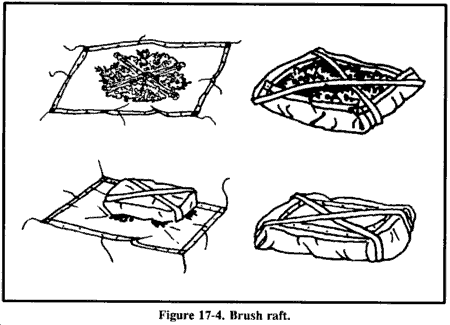 RAFTSIf you have two ponchos, you can construct a brush raft or an Australian poncho raft. With either of these rafts, you can safely float your equipment across a slow-moving stream or river. Brush RaftThe brush raft, if properly constructed, will support about 115 kilograms. To construct it, use ponchos, fresh green brush, two small saplings, and rope or vine as follows (Figure 17-4):