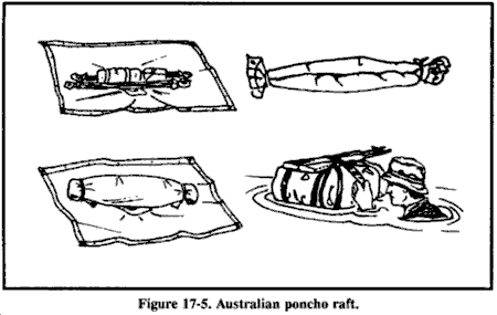 Australian Poncho RaftIf you do not have time to gather brush for a brush raft, you can make an Australian poncho raft. This raft, although more waterproof than the poncho brush raft, will only float about 35 kilograms of equipment. To construct this raft, use two ponchos, two rucksacks, two 1.2-meter poles or branches, and ropes, vines, bootlaces, or comparable material as follows (Figure 17-5):
