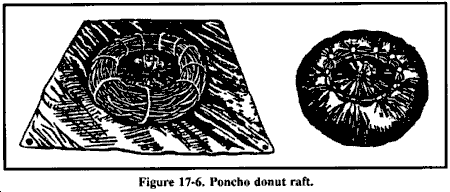 Poncho Donut RaftAnother type of raft is the poncho donut raft. It takes more time to construct than the brush raft or Australian poncho raft, but it is effective. To construct it, use one poncho, small saplings, willow or vines, and rope, bootlaces, or other binding material (Figure 17-6) as follows: