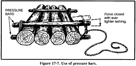 When launching any of the above rafts, take care not to puncture or tear it by dragging it on the ground. Before you start to cross the river or stream, let the raft lay on the water a few minutes to ensure that it floats. If the river is too deep to ford, push the raft in front of you while you are swimming. The design of the above rafts does not allow them to carry a person's full body weight. Use them as a float to get you and your equipment safely across the river or stream. Be sure to check the water temperature before trying to cross a river or water obstacle. If the water is extremely cold and you are unable to find a shallow fording place in the river, do not try to ford it. Devise other means for crossing. For instance, you might improvise a bridge by felling a tree over the river. Or you might build a raft large enough to carry you and your equipment. For this, however, you will need an axe, a knife, a rope or vines, and time. Log RaftYou can make a raft using any dry, dead, standing trees for logs. However, spruce trees found in polar and subpolar regions make the best rafts. A simple method for making a raft is to use pressure bars lashed securely at each end of the raft to hold the logs together (Figure 17-7).