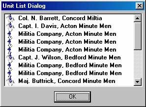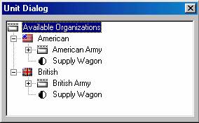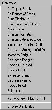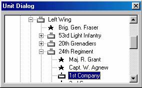 The Unit Dialog displays all of the units in the Order-of-Battle that have not been placed on the map or placed as a reinforcement. To place a unit on the map, first find the unit in the Unit Dialog and select it. Then, ensuring that the Editor is in Place Mode, click on the hex to place the unit with the right mouse button. After placement, the unit will be selected and can be modified relative to such factors as facing and strength by using the Command Menu or buttons on the Toolbar. To move units from one hex to another on the map, select the selects and, ensuring that the Editor is in Move Mode, click on the hex to move the units to with the right mouse button. Use Remove From Map in the Command Menu to remove unnecessary units from the map.