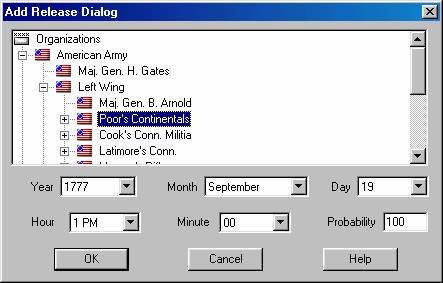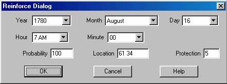 Adding reinforcements to the current scenario is a two step process. First, identify the units to be added as reinforcements in the Unit Dialog and place them on the map at the location of the entry hex. You should ensure that the units have a facing that is appropriate for their entry onto the map and that they are in the appropriate formation such as Line or Column. Second, after selecting all of the reinforcements that are to arrive as one group, select Add Reinforcement from the Units Menu. This will display the Reinforce Dialog so that additional information such as the arrival time can be entered. Having done this, the units will be removed from the map and a reinforcement entry will be generated for the current scenario.